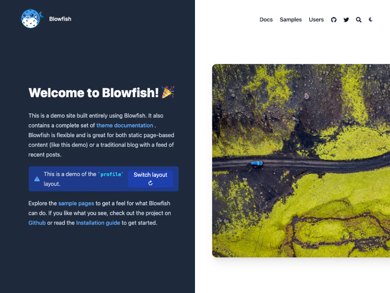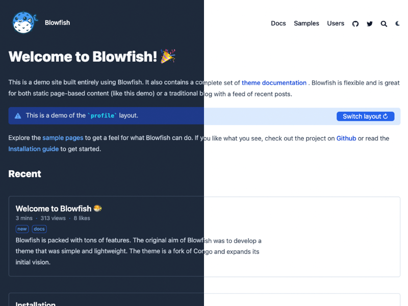 Blowfish provides a fully flexible homepage layout. There are two main templates to choose from with additional settings to adjust the design. Alternatively, you can also provide your own template and have complete control over the homepage content.