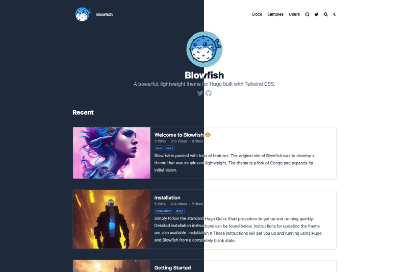 Blowfish was built so it would be easy to add visual support to your articles. If you’re familiar with Hugo article structure, you just need to place an image file (almost all formats are supported bue we recommend .png or .jpg) that starts with feature* inside your article folder. And that’s it, Blowfish will then able to both use the image as a thumbnail within your website as well as for oEmbed cards across social platforms.
